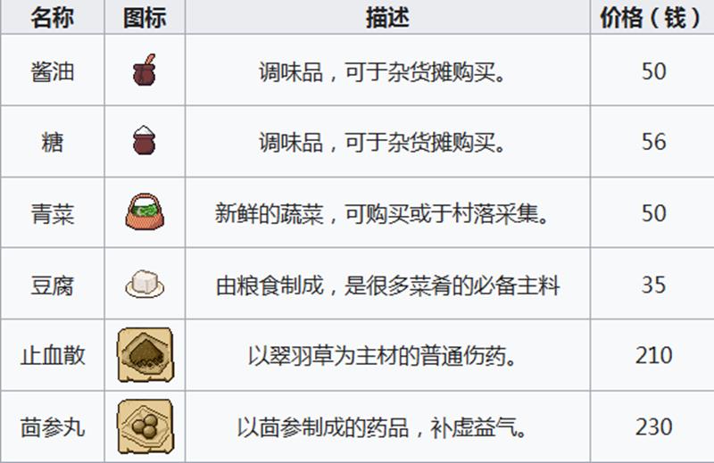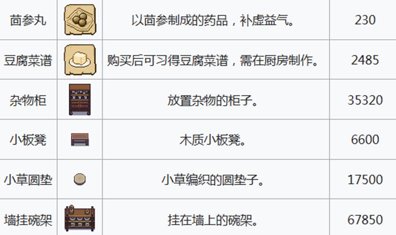 在曹云惠的摊位上可以购买到多种物品。调味品类包括售价50钱的酱油和60钱的糖;新鲜蔬菜如青菜售价50钱,也可在村庄采集替代;豆腐作为常用食材,价格为35钱。此外还能学习豆腐菜谱,售价2485元,购买后可在厨房制作相关菜肴。药物方面提供止血散(210钱)和茴参丸(230钱),后者具有补虚益气效果。她还出售木质小凳子(6600钱)、小草垫子(17500钱)、杂物柜(35320钱)以及碗架(67850元)等家居用品。