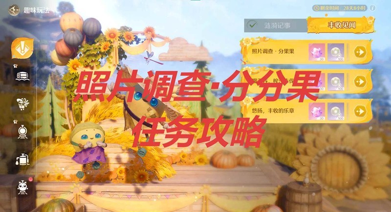 无限暖暖是一款多平台开放世界换装冒险游戏,旅途中,暖暖和大喵也会遇见神奇的境况、难解的谜题——两人齐心协力克服困难,是彼此冒险路上最好的伙伴。那么游戏照片调查·分果果、慢吞吞,榨汁步伐!应该怎么完成呢?小编为你准备了一份攻略,一起来看看吧~
