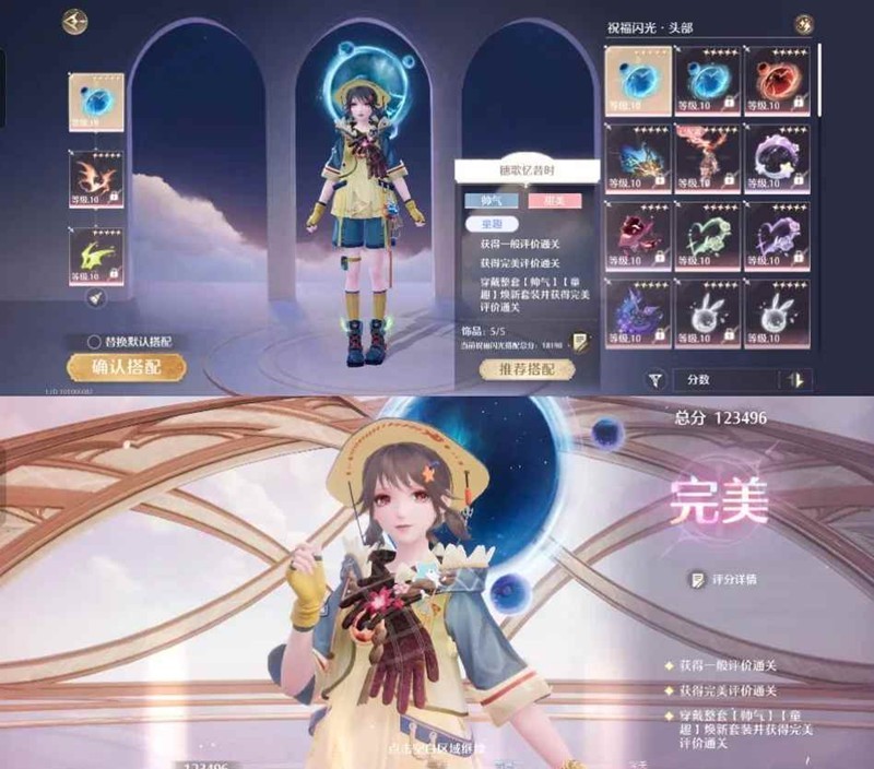 这一关要求整套帅气童趣焕新套装,如图7所示符合条件的有六套,有纸鹤套的直接用,没有的推荐常驻鲨鱼套和这一次的陪跑四星稻草人,三星套装分数要想达到完美很难。