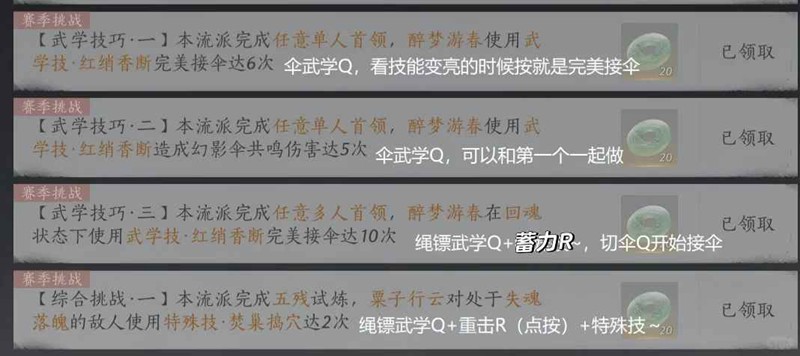 1.五残试炼简单两把,绳镖挂失魂落魄~打中(两次)接滚轮换伞完美接伞6次共鸣伤害5次