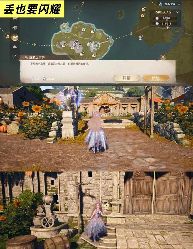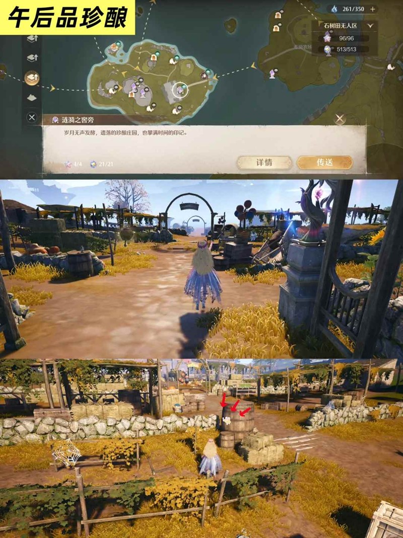 位置:传送落地后向身后走,经过一个木质拱门后,史丢丢在路右侧最大的木桶后面。