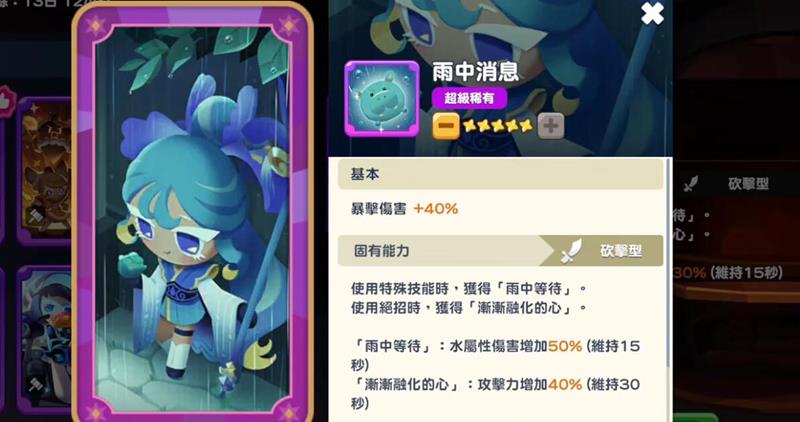 阵容搭配方面,推荐白玉草饼干负责治疗,牛奶饼干提供额外护盾支持。虽然理论上全输出配置效率更高,但在缺乏辅助的情况下难以稳定叠满层数。法宝卡选择雨中消息,可在蓄力命中后增加25%暴击伤害,进一步强化爆发窗口。培养优先级建议先提升奔流激浪与波涛奔腾两个技能,再升级法宝,最后拉满等级,确保关键技能覆盖率。