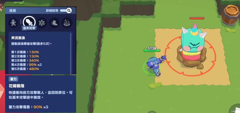 该主动技能包含五段伤害,基础倍率为130%×2→340%→95%×2→480%,但只有在蓄力命中并叠满五层浪花印记后才能打出全额伤害。这一机制要求玩家精准把控攻击时机,确保每一发蓄力都能命中目标以维持层数。技能设计强调操作连贯性,一旦中断将严重影响输出循环,因此实战中需特别注意站位与敌方移动轨迹。