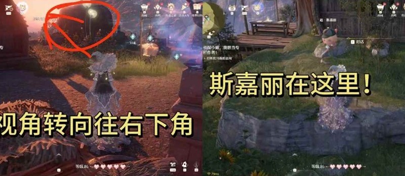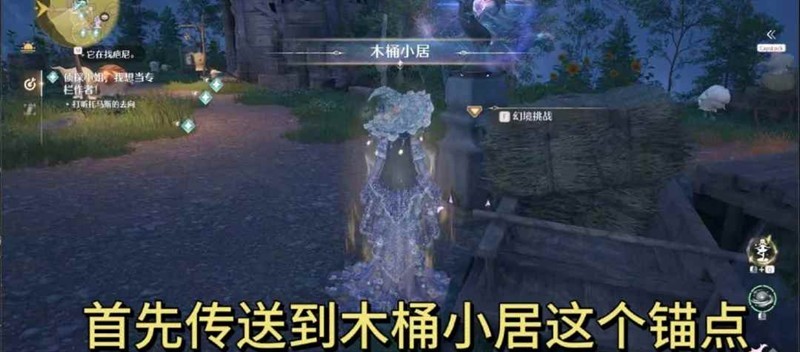 首先传送到木桶小居这个锚点 然后往地图右下角看 一直往右下角走如图木桶前面就可以看到斯嘉丽然后触发【侦探小姐,我想当专栏作者】这个逸事了