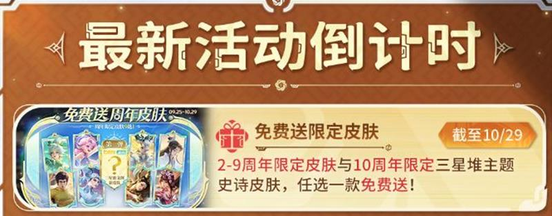 活动内容:2-9周年限定皮肤与10周年限定三星堆主题史诗皮肤任选一款,免费送!
