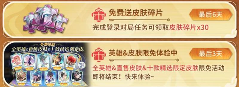 活动内容:完成登录对局任务,免费领取皮肤碎片*30。