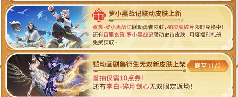 活动内容:张良联动勇者皮肤,48皮肤碎片兑换。百里玄策联动史诗皮肤,月度福利礼册免费获取。