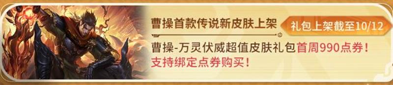 活动内容:曹操-万灵伏威传说皮肤超值礼包上架,990点券得皮肤+按键,支持绑定点券购买。