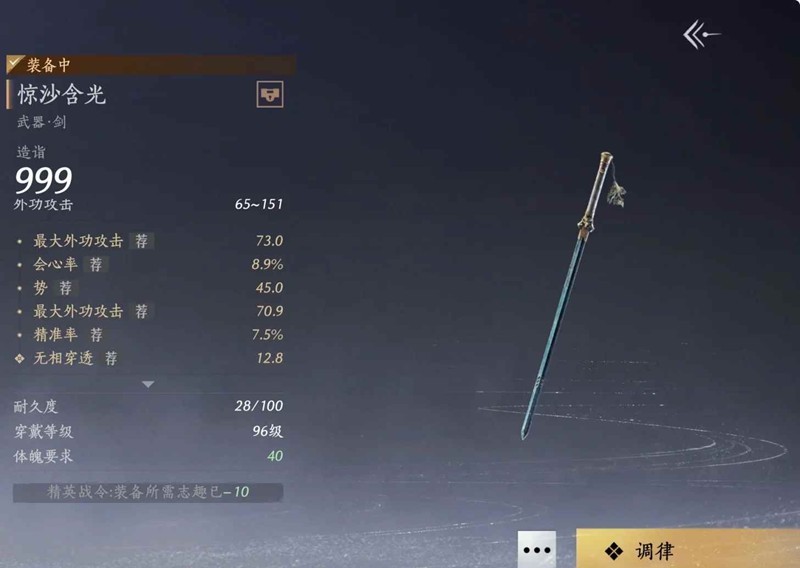 其他没有的不适合pve。虚构一个版本毕业面板大致为精准95%+,会意39%,会心40%,大攻3500必带剑增,4外穿4蓄力增伤定音。t3以下一条属性没有。