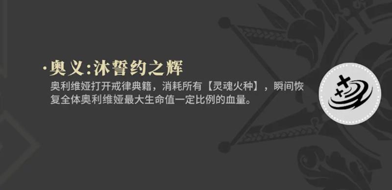 奥利维娅的大招以戒律典籍为核心,需消耗战斗中积累的“灵魂火种”才能释放。释放后,她将翻开典籍,为全体队友恢复生命值,恢复量基于她自身最大生命值的比例计算。这一特性使得奥利维娅在团队中具备极强的辅助价值,尤其是在高生命值配置下,治疗量极为可观。结合其技能自回血与能量循环机制,奥利维娅更适合定位为后排辅助型输出角色,在保证生存的同时为团队提供持续支援。