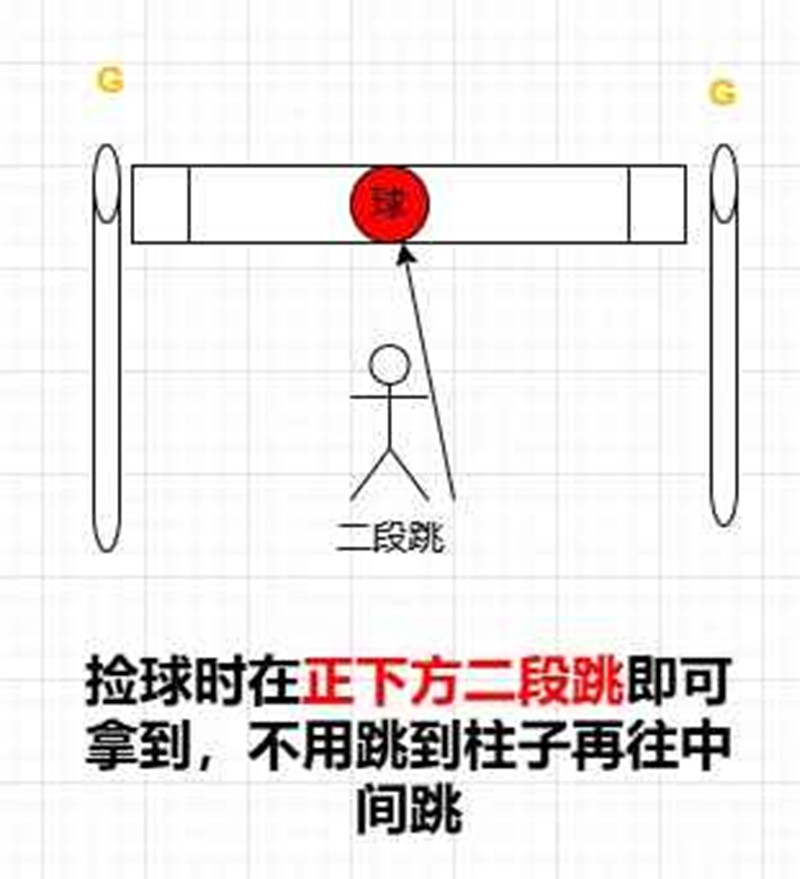 3、 击飞后球会掉柱子边上,二段跳即可拿回来,球捡到会随机出现队友身上