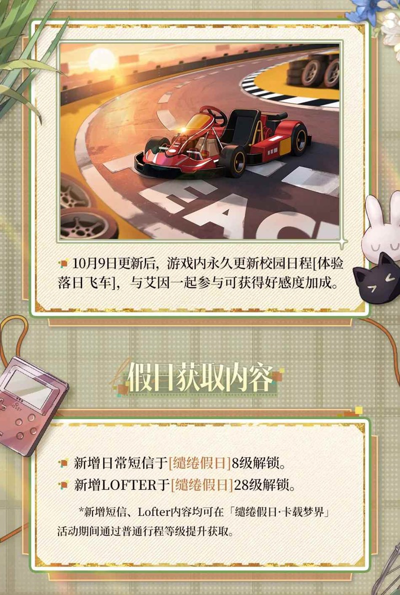 10月9日更新后 - 11月20日05:00,在「缱绻假日·卡载梦界」活动期间提升[假日行程]等级到8级和28级,可分别解锁全新短信和Lofter内容。