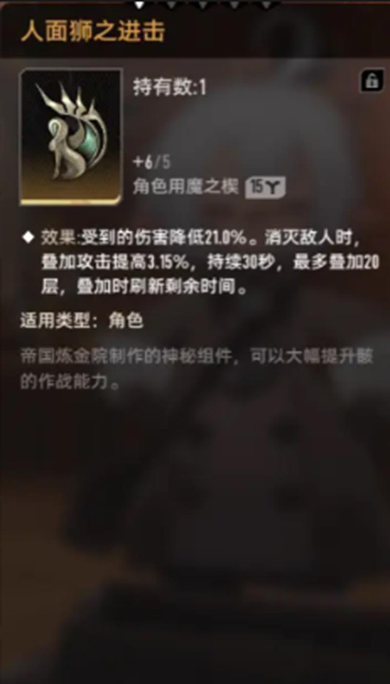 人面狮之进击则侧重于增强角色的持续作战能力。装备后可减少21%所受伤害,提高角色在高压环境下的存活率。每当击败敌人时,还能叠加3.15%的攻击力,持续30秒,最多叠加20层。由于每次新增层数会刷新持续时间,只要保持连续击杀,攻击增益便可维持在满层状态。这意味着在密集刷图或连续挑战多个小怪的场景下,角色的输出将随战斗进程不断攀升。这种机制特别适合清剿型角色,在长时间战斗中展现出强大的成长潜力。