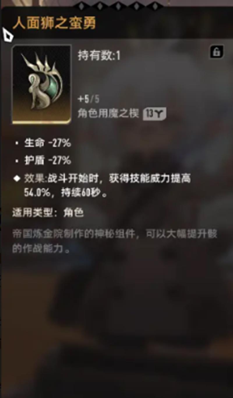 人面狮之蛮勇为团队提供了爆发窗口期。虽然牺牲了27%的生命值与护盾强度作为代价,但在战斗开始的前60秒内,技能威力提升高达54%。这一特性使其成为爆发型角色的理想选择,尤其是在限时BOSS战或需要快速压低敌方血线的场合。许多依赖起手大招建立优势的角色,可通过此组件在开局阶段打出远超常态的伤害量,甚至实现一击制胜的效果。需要注意的是,该组件更适合短时高强度输出策略,需确保主力技能能在增益期间完成释放。