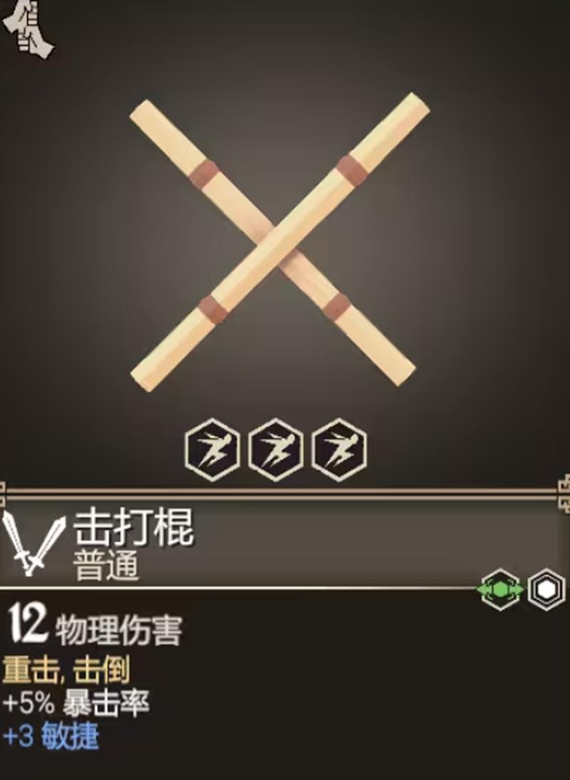 击打棍作为棍法类武器的代表,基础物理伤害为12点,具备重击能力但暴击率加成仅为5%。敏捷属性提升3点,整体输出能力偏弱。虽然动作流畅且适合连击构建,但在为了吾王的实际战斗中,其表现不如锤类或斧类武器亮眼。建议仅在特定流派或剧情需求下使用。