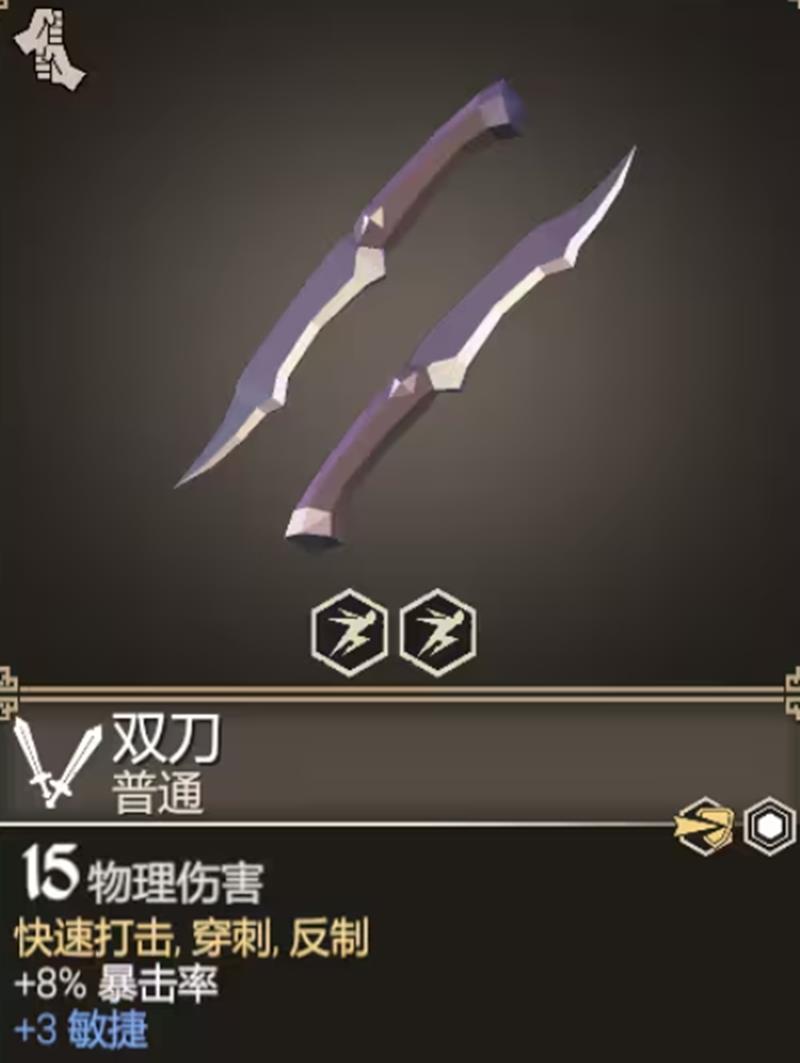 双刀武器提供15点物理伤害,具备快速打击特性,能提升攻击速度。在输出过程中可触发穿刺与反制压制效果,适合应对高攻敌人。暴击率提升8%,敏捷加成3点,整体偏向刺客类角色的战斗风格。在为了吾王的回合制框架下,攻速提升意味着更频繁的技能释放机会,对节奏掌控有积极影响。