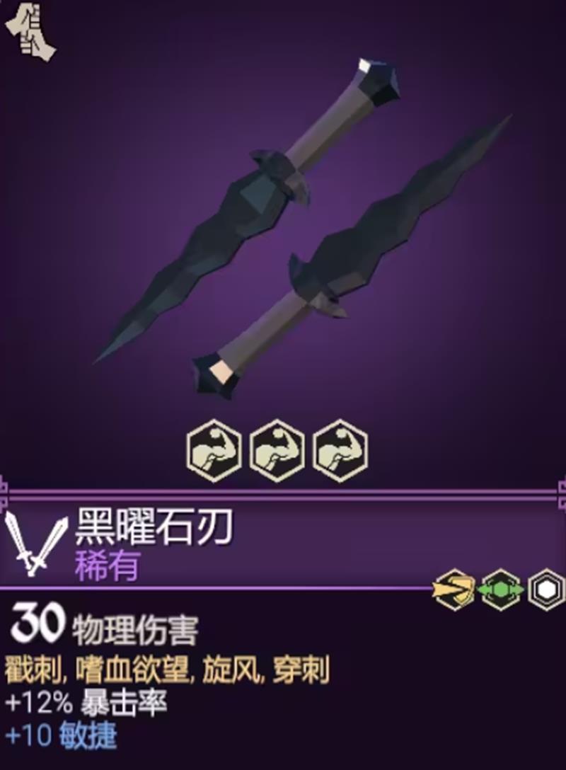 黑曜石刃是稀有品质的紫色武器,基础物理伤害高达30点,为目前提及武器中最高。其旋风穿刺效果强度优于蓝色品质武器,暴击率加成达到12%,敏捷属性一次性提升10点。在为了吾王的后期内容中,黑曜石刃属于顶级近战选择之一,适合追求极限输出的玩家配置。