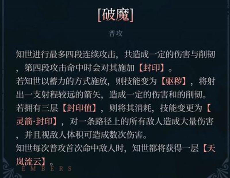 知世在辉烬中被称为青渊神侍,是一位兼具输出与支援能力的角色。她的武器名为天岚流云箭,是玉虚院家族专属的兵器,赋予她在战斗中独特的攻击节奏与技能联动。知世的普攻名为破魔,共分为四段,每一段都能造成伤害并叠加战术效果。前几段攻击可对敌人施加削刃状态,削弱其防御能力。当第四段命中时,还能附加一层封印效果,为后续技能触发创造条件。