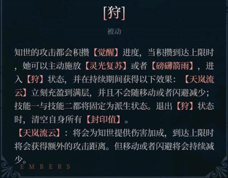 她的被动技能名为狩,当觉醒值达到上限后可主动激活,进入狩状态。在此状态下,天岚流云层数立即充满,并不会因移动或闪避而减少。同时,技能一与技能二将转变为派生形态,大幅提升机动性与连招流畅度。一旦退出狩状态,所有已积累的封印层数将被清除,因此需合理规划释放时机,确保在关键战斗阶段发挥最大效能。