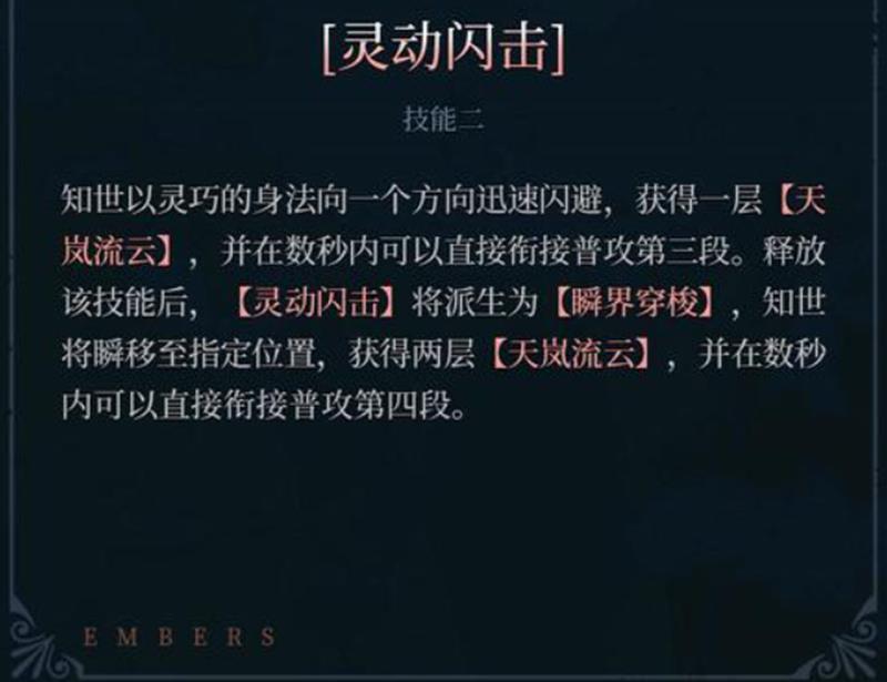 技能二为灵动闪击,使用后可快速闪避一次,并获得一层天岚流云增益。随后几秒内可无缝衔接下一段普攻,提升连招流畅性。释放该技能后,其将转变为派生形态,具备瞬移效果,可将知世传送至指定位置,并额外获得两层天岚流云。此技能不仅增强了生存能力,也为后续输出创造了有利位置,是知世在战斗中调整站位的关键手段。