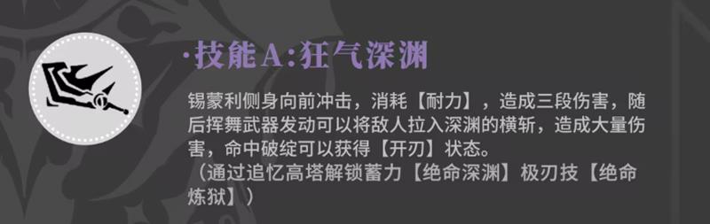 这是锡蒙利的核心基础技能,也是她主要的输出手段之一。技能释放时,锡蒙利会向前突进并发动侧身斩击,消耗耐力造成三段连续伤害,随后衔接一次横斩。技能特效中伴随深渊裂隙的视觉表现,不仅能将敌人短暂控制于裂隙中,还能在横斩阶段打出高额爆发。该技能在连招中衔接流畅,适合用于起手或衔接其他控制技能。