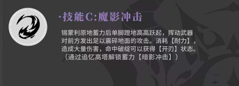 作为高爆发技能,魔影冲击需要短暂蓄力,随后对前方大范围区域发动强力斩击,造成大范围物理伤害并震碎地面。技能命中敌人破绽时可触发“开刃”效果,进一步提升后续伤害。该技能在面对精英怪或Boss时尤为有效,配合控制技能使用可稳定打出弱点伤害,是锡蒙利在高难度关卡中的关键输出手段之一。