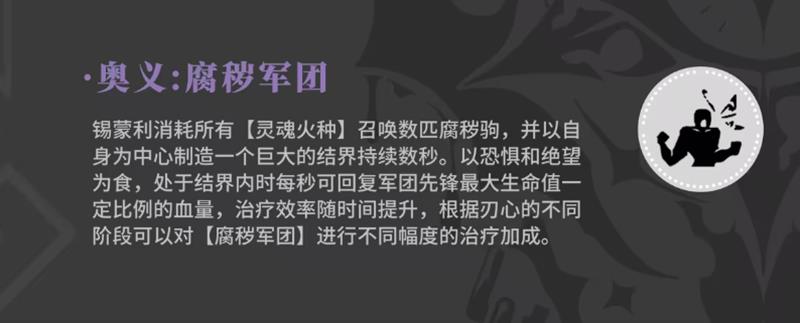 锡蒙利的大招需消耗所有灵魂火种,召唤腐秽军团的灵体成员,在战场中央生成一个持续较久的结界。结界内敌人会持续受到负面状态影响,如减防、减速等,而己方队友则获得治疗效率提升与生命恢复加成。特别的是,结界对锡蒙利自身的治疗效果会根据当前韧性阶段动态增强,使其在高韧性状态下具备更强的生存与辅助能力,进一步强化了她在召唤流体系中的核心地位。