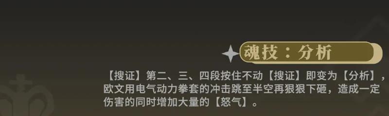分析是欧文的魂技,可通过普攻衔接触发强化效果。在完成第二次、第三次与第四次普攻时,若长按技能键,即可将该次攻击转化为分析技能。此时欧文会启动电气动力全套装置,跃向空中并对目标区域发动强力下砸,造成范围伤害的同时大幅增加怒气。这一机制让他的连招更具策略性,也提升了战斗中的资源获取效率。