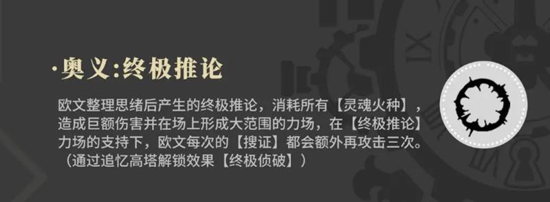 大招终极推论需消耗全部灵魂火种释放。施放后,欧文在造成高额伤害的同时,会在战场生成一个大范围力场,对其中敌人追加三次额外攻击。力场的伤害效果受区域布置影响,合理放置可覆盖更多敌人,显著提升整体输出效率。该技能在团战中具备极强的压制力。