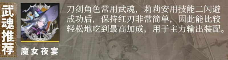 魔女夜宴是刀剑角色中强度顶尖的武魂之一,特别契合莉莉安这位冠2级别烬天使。其机制允许角色通过技能二成功闪避敌人攻击后,更容易维持红刃状态。红刃状态下不仅伤害提升明显,连招流畅度也大幅增强,使得莉莉安在实战中既能生存又能打出高额输出,成为当前版本中备受青睐的主力输出配置。