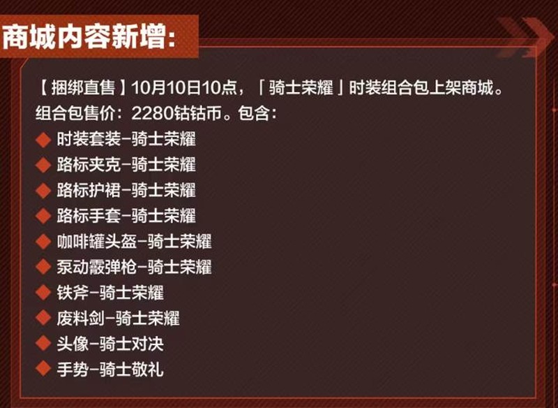【捆绑直售】10月10日10点,「骑士荣耀」时装组合包上架商城。组合包售价:2280钻钻币。包含:
