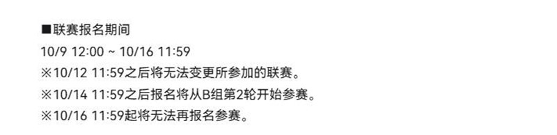 ※10/12 11:59之后将无法变更所参加的联赛。