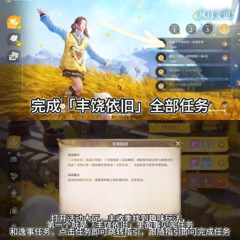 打开活动大厅,丰收季找到趣味玩法,第一个就是「丰饶依旧」里面事见闻任务和逸事任务,点击任务即可跳转指引,跟随指引即可完成任务