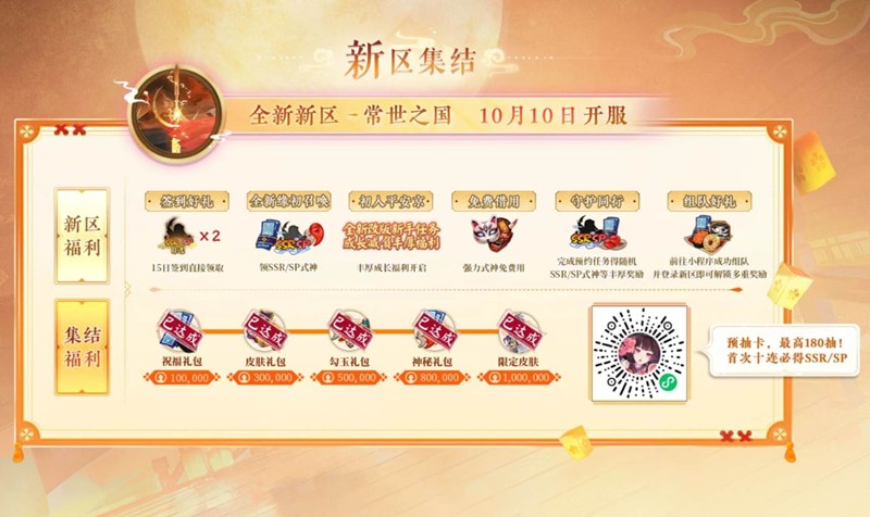 新区集结奖励:新区开启前,阴阳师大人们可以通过游戏开始画面左下角的“新区集结”按钮参与集结活动,当总集结人数达成10万/30万/50万/80万/100万的要求后,新区开启后在新区创建角色的阴阳师大人均可获得对应的丰厚奖励。奖励内容包括神秘的符咒、皮肤券、勾玉、经验加成、招福达摩、奉为达摩、御行达摩以及雪女皮肤·月见之樱等。