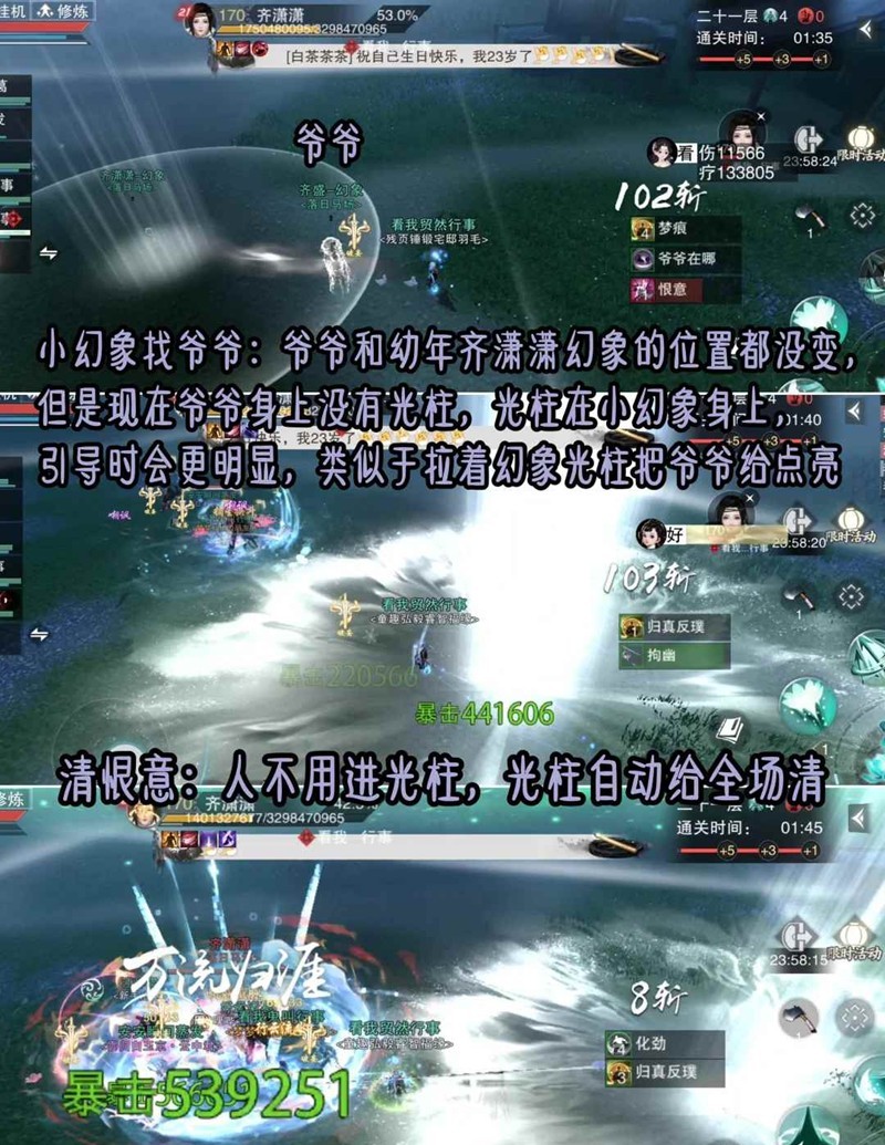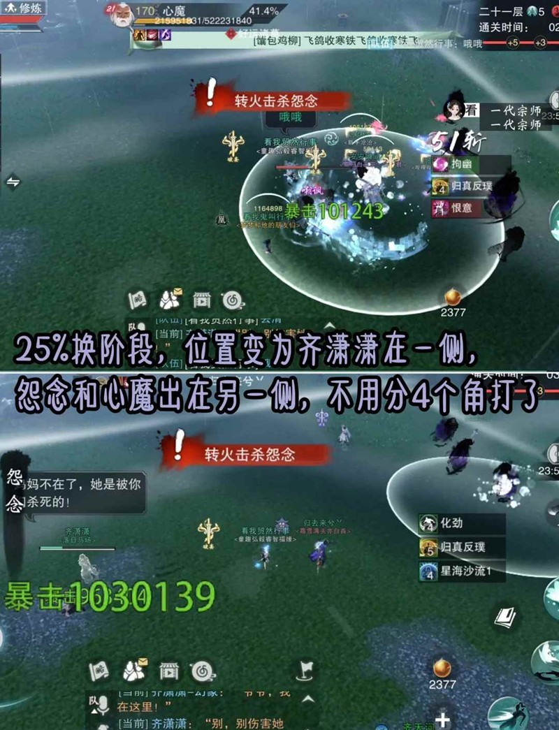 ③破境阶段:25%换阶段,位置变为齐潇潇在一侧,怨念和心魔出在另一侧,不用分4个角打了