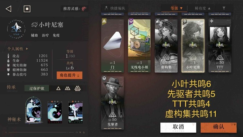 共鸣只需要能活就行,比如图非六星角色只有共鸣4-6一键摆放。心相除了先驱者需要诺蒂卡专武,想提高容错早一回合开大给TTT带无韵律跳步(笃笃骨的),其他哪个耐活用哪个