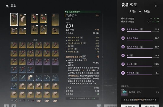 装备的套装类型保持不变,所有调律定音词条的类型和数值保留,但数值上限拓展至96阶,基础属性提升至96阶,承音后的装备无法放入武库也不再支持调率和转率,因此在选择继承时需谨慎