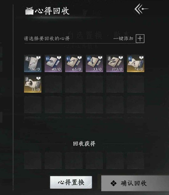 *心得置换:开完心法箱子在“心得置换”页面可以回收用不到的心法页转换成书票,把需要的四个心法锁起来,然后一直循环回收不需要的转换成需要的。