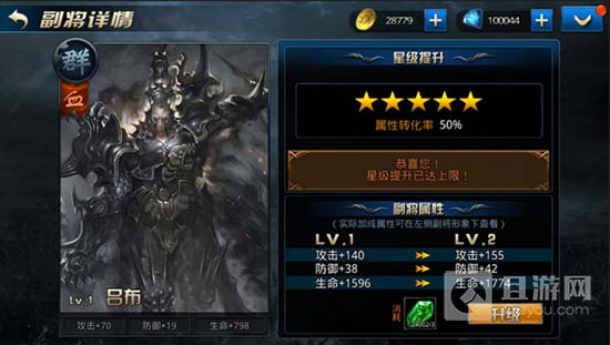 副将等级会影响副将的属性,(副将每增加一级都能增加相应的攻击、防御、生命值属性,如果你装备和别人一样,但是你的副将等级高很多,那差距可是不容小觑的)星级会影响副将属性的转化率,星级每提升一级,属性转化率就会增加5%。(注:属性转化最高可达到50%)所以在升级副将的同时别忘了提升副将星级(副将提升等级、星级的话,需要在MOBA商城购买潜龙石和不同品质的将星石)