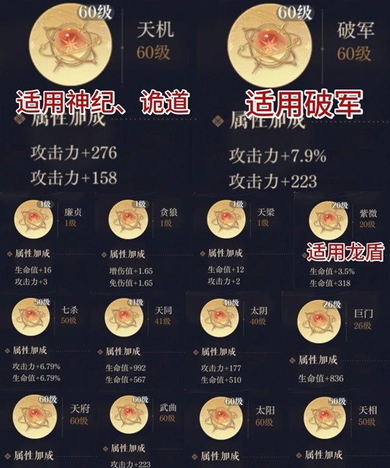 星石搭配:对于主星来说,星石组合推荐分为攻击、生命两种;对于辅星来说,推荐通过密探属性和战斗形式进行辅星组合,分为普攻、大招增伤,和风、火、水、土、阴、阳增伤。