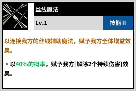 该技能为单体攻击加增益组合技,能对一名敌人造成80%攻击力的伤害,并以丝线鞭击形式完成打击。攻击后会自动为己方当前攻击力最高的队友施加命中提升效果,持续两个回合。该命中增益幅度为25%,有效提高主力输出角色的技能命中率,减少miss情况,在面对高闪避敌人时尤为关键。
