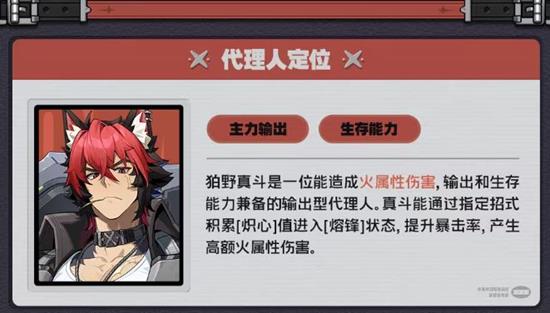 狛野真斗是一位能造成火属性伤害,输出和生存能力兼备的输出型代理人。真斗能通过指定招式积累[炽心]值进入[熔锋]状态,提升暴击率,产生高额火属性伤害。