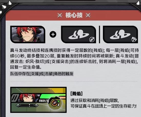 残焰:真斗发动终结技和连携技时获得一定层数的[残焰];每一层[残焰]可持续60秒,最多叠加20层,重复触发时持续时间将被刷新;真斗发动[普通攻击:炽风·脉切]或[支援突击]的连续斩击时,则将消耗一层[残焰],回复一定生命值。