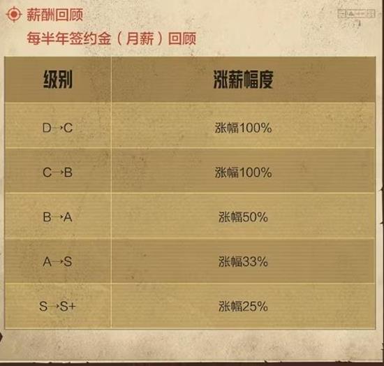 涨薪幅度:每半年签约金(月薪)回顾,不同级别之间的涨薪幅度从25%到100%不等。