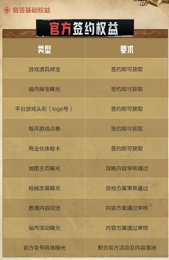 基础权益:签约即可获得游戏道具掉宝、端内掉宝曝光、平台游戏头衔(logo号)、每月游戏点券、商业化体验卡等。