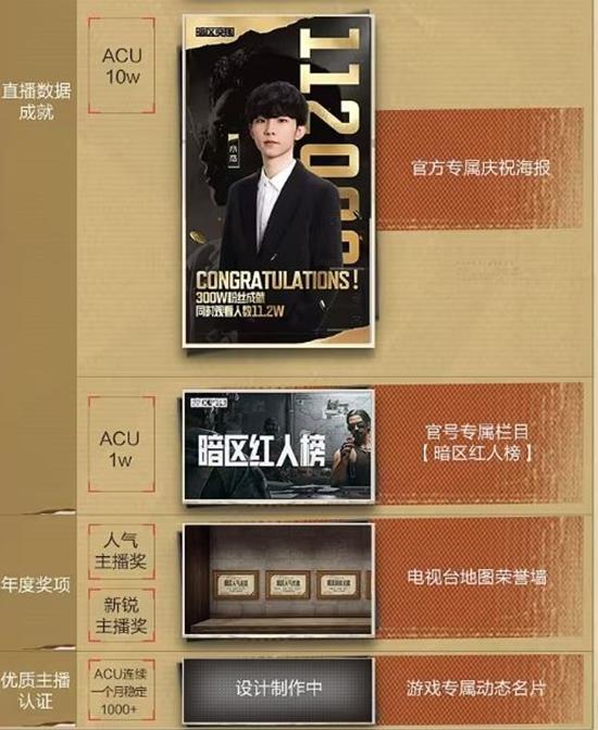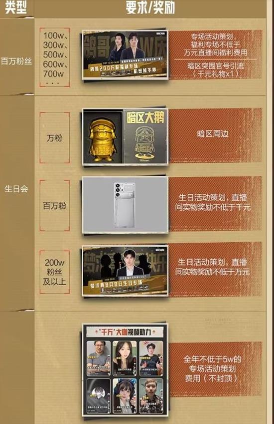 百万粉丝:根据不同的粉丝量级,主播可以获得专场活动策划、福利专场、暗区突围官号引流等。
