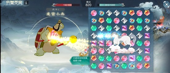 1.分别点击或者拖动可移动棋子,棋子纵向和横线排列3个以上时消除得分并对守卫造成伤害。