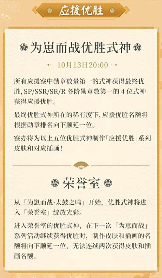 为了庆祝优胜式神的诞生,寮办将为这五位式神制作「应援优胜」系列皮肤和对应的精美插画。