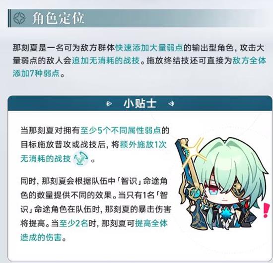 那刻夏是一名能够为敌方群体快速添加大量弱点的输出型角色。她的攻击可以对拥有大量弱点的敌人追加无消耗的战技,施放终结技时还能直接为敌方全体添加7种弱点。