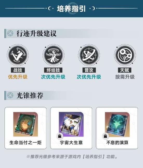 行迹升级建议:优先升级战技,次优先升级终结技,普攻次优先升级,天赋按需升级。